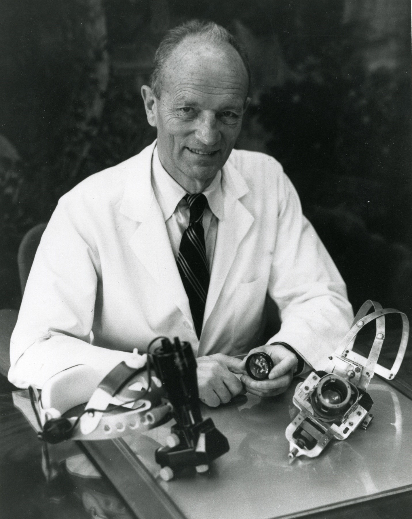 A giant step forward for correctly identifying the anatomy of RD and associated breaks was the binocular indirect ophthalmoscope, developed by Charles Schepens, MD. His first version, developed in 1947, was unwieldy, using an electric light source supported by a stand (Figure 3).[7] A head-mounted version was developed 4 years later,[8] and this basic design is still in use (Figure 4).