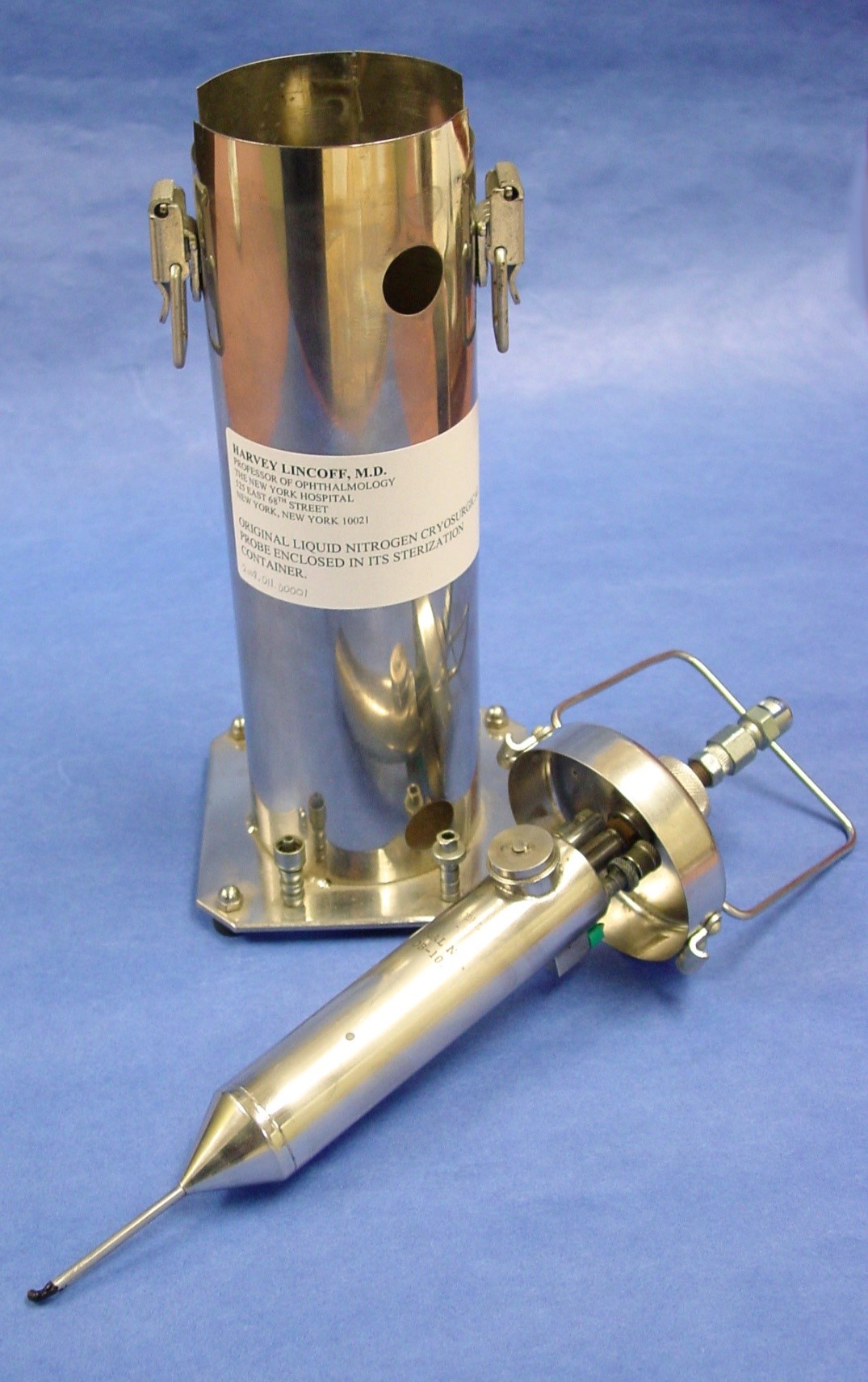 In the 1960s, Harvey Lincoff, MD (Figure 7) made 2 major contributions that advanced the field. First, he revisited cryotherapy using a device (Figure 8) employing liquid nitrogen for freezing effect, which had advantages over diathermy and thermal photocoagulation. It was not destructive to the sclera and did not require the breaks to be flat on the retinal pigment epithelium to be effective.[12]
