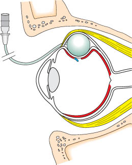 Figure 4: Lincoff-Kreissig balloon insertion Sagittal section of the orbit showing the balloon in Tenon’s capsule shortly after insertion. The balloon is compressed (it has a slightly oval shape) between the globe and the bony orbit. The intraocular pressure is increased.